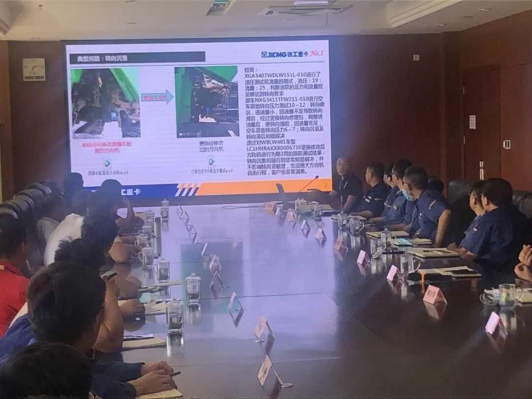 會議圍繞目前市場上的自卸車產(chǎn)品質(zhì)量問題、產(chǎn)品技術(shù)升級難題展開討論,深入剖析自身不足并建立改進項目。各家服務(wù)站分別對所在區(qū)域自卸車存在的典型問題和改進建議進行匯報,技術(shù)中心和品質(zhì)管理部圍繞服務(wù)站提出的問題建議,從管路優(yōu)化、人機工程、后期改裝及維修便利性等多個方面進行深入互動交流。