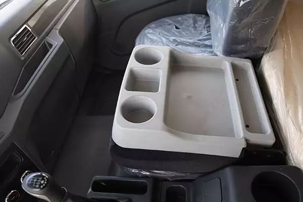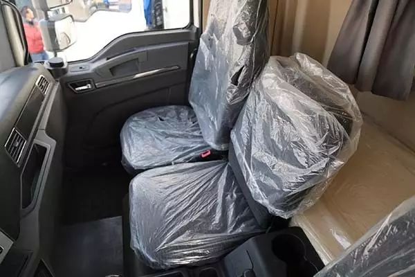 座椅為“三座”設(shè)計(jì),中央座椅可折疊,作為杯架和小桌板,貼心實(shí)用。座椅后方的臥鋪寬度較大,明顯高于市場(chǎng)一般產(chǎn)品,并且,摸起來(lái)手感很好,柔軟舒適,將有利于駕駛員日常休息。